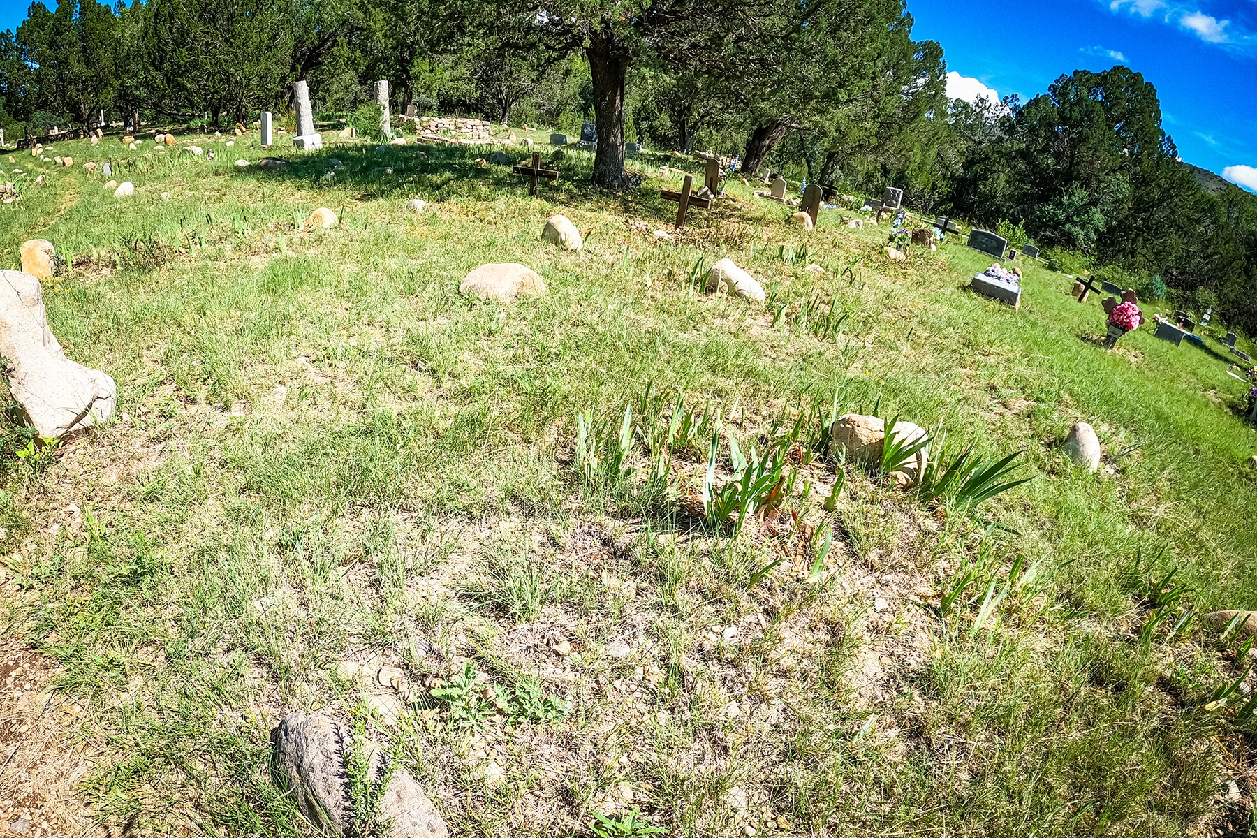 Our first stop on the way was in Lincoln, New Mexico. If you are not aware, this town is famous for Billy the Kid and the Lincoln County War. There are several historic homes in Lincoln, as well as the famous Old Lincoln County Courthouse with museum exhibits. You can walk in the footsteps of Billy the Kid, Pat Garret and other characters from the west. They have some cute shops too. This was the first time (since I moved to New Mexico in 1980) that I saw the Torreon was open to the public, so that was a treat. Just outside of Lincoln is a historic graveyard. One of the most interesting things about this was the thousands of irises someone had painstakingly planted. I can’t imagine how beautiful it is when they are blooming. I recommend people attend the Old Lincoln Days – usually the beginning of August. They have reenactments and a huge festival. The Friends of Historic Lincoln, New Mexico have some great information if you plan on visiting.